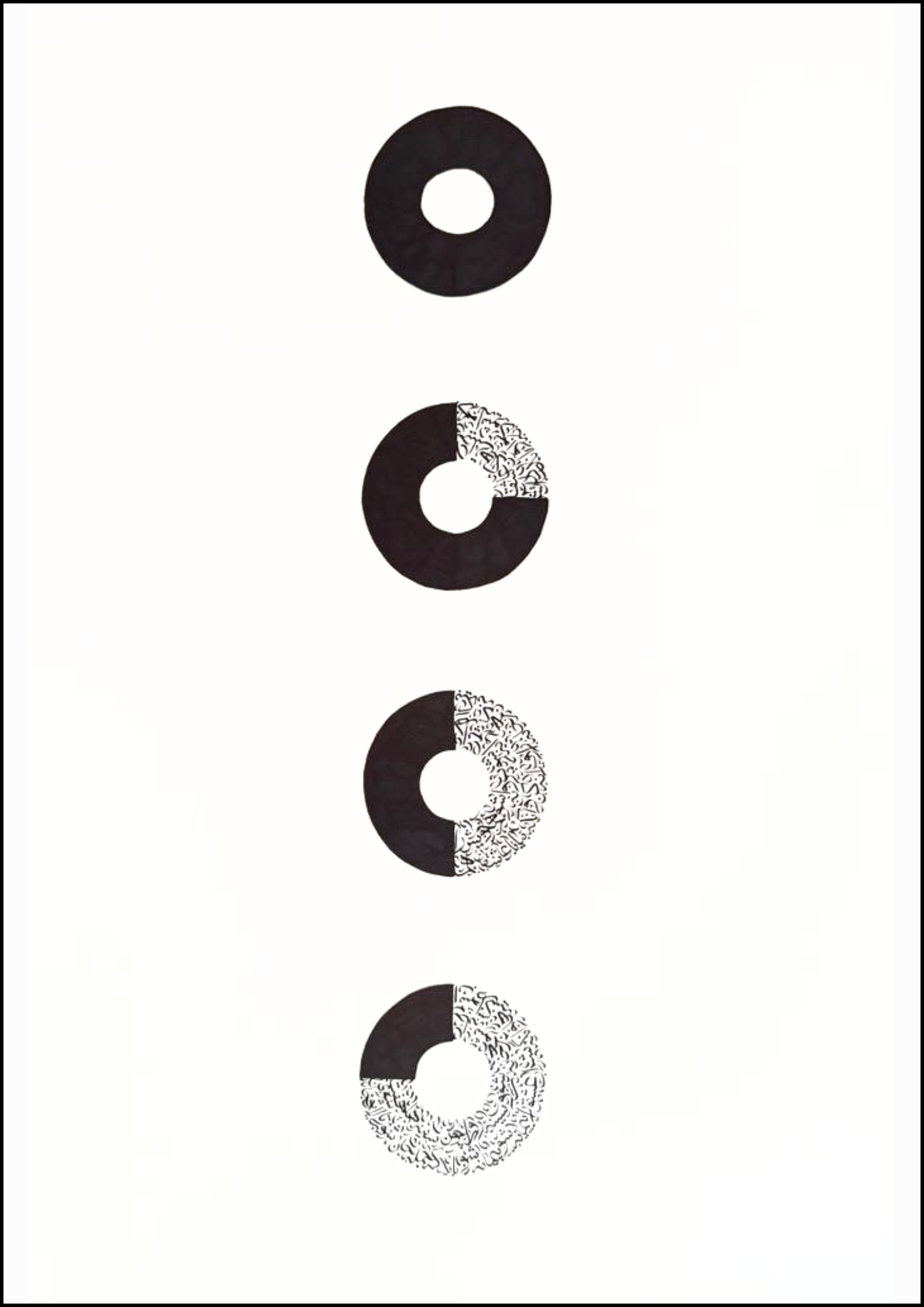 Rooted entirely in the poetry of Rumi, Letters to Light invites viewers into a transcendent encounter with the written word. Through fluid ink, layered repetition, and intentional silence, Rahil Beigi transforms verse into visual rhythm—each composition a devotional act, each gesture a bridge between the earthly and the divine.